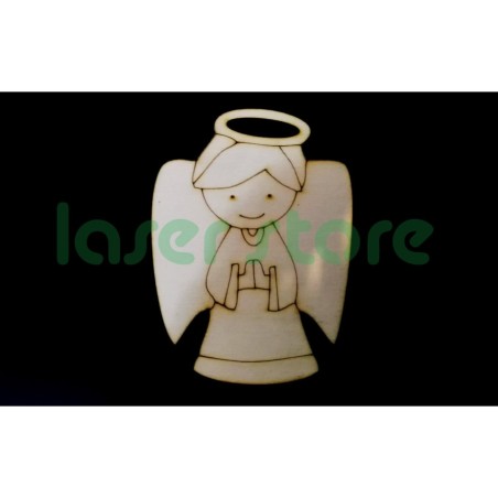 Placa em choupo, cortada e gravado a laser, formato de anjo.