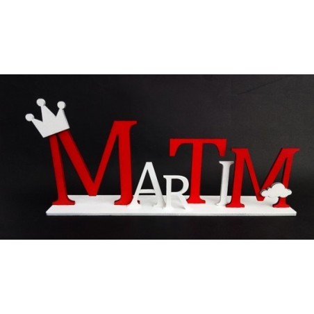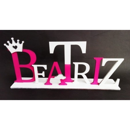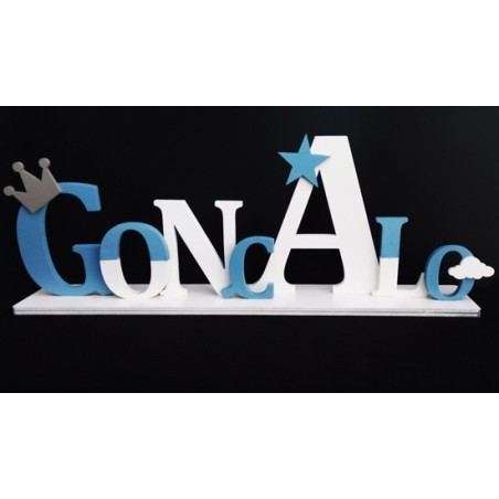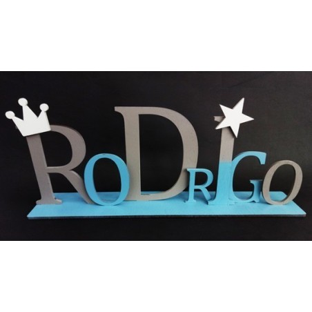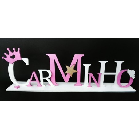 Nome em Madeira, cortado a laser, com base de encaixe (Ideal para colar), letras individuais com desnivelamento entre elas, com aplicações para rapaz e rapariga.