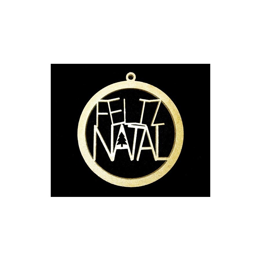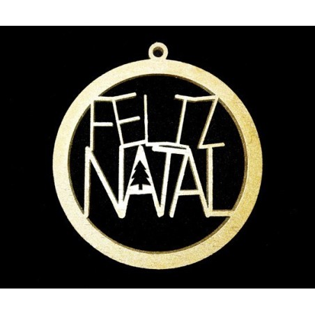 Pendente em choupo, redondo, com furo, com Frase Feliz Natal.