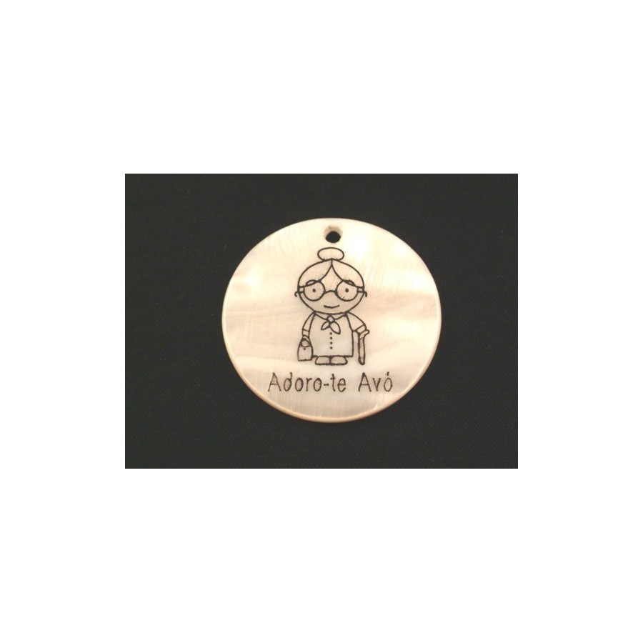 Pendente redondo em madre pérola, personalizado com desenho de avó e frase, "Adoro-te Avó"
