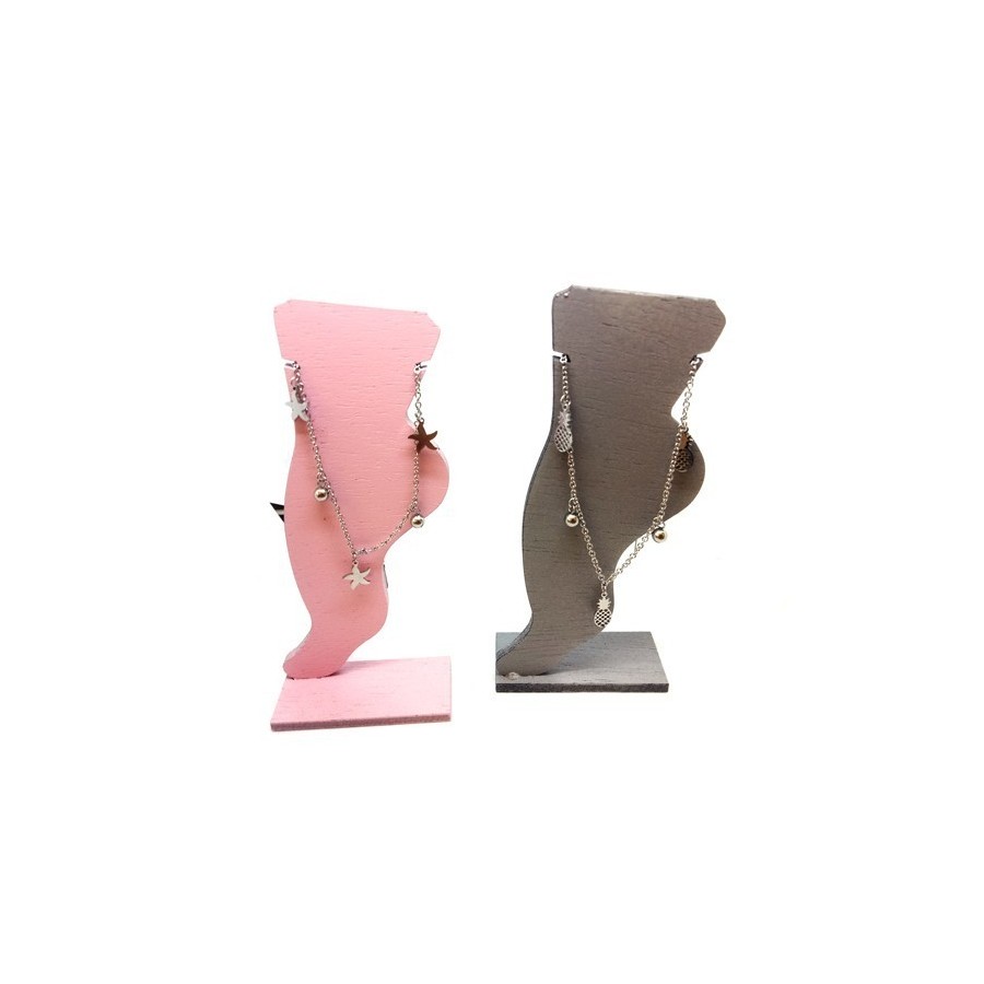 Expositor em madeira, formato de pé, com recortes lateriais para colocação de pulseira.