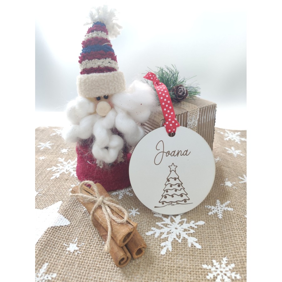 Não esquecer de gravar a sua personalização para poder adicionar ao carrinhoBola de Natal em mdf laminado a branco ou choupo de cor madeira natural, com gravação e recorte a laser.
