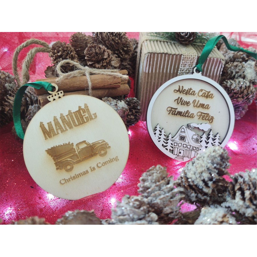 Não esquecer de gravar a sua personalização para poder adicionar ao carrinhoBola de Natal em choupo cor madeira natural ou mdf laminado a branco, com gravação e recorte a laser.