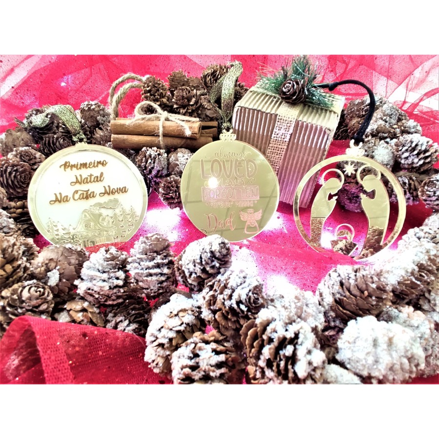 Não esquecer de gravar a sua personalização para poder adicionar ao carrinhoBola de Natal em acrílico dourado espelhado, com gravação e recorte a laser.
