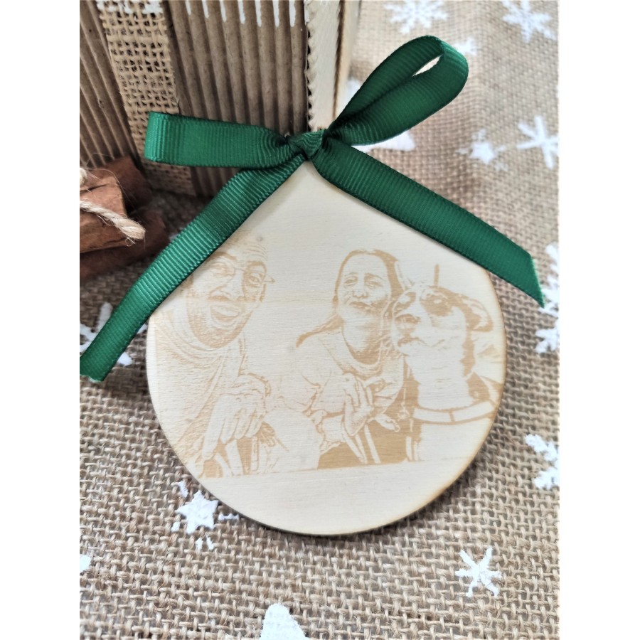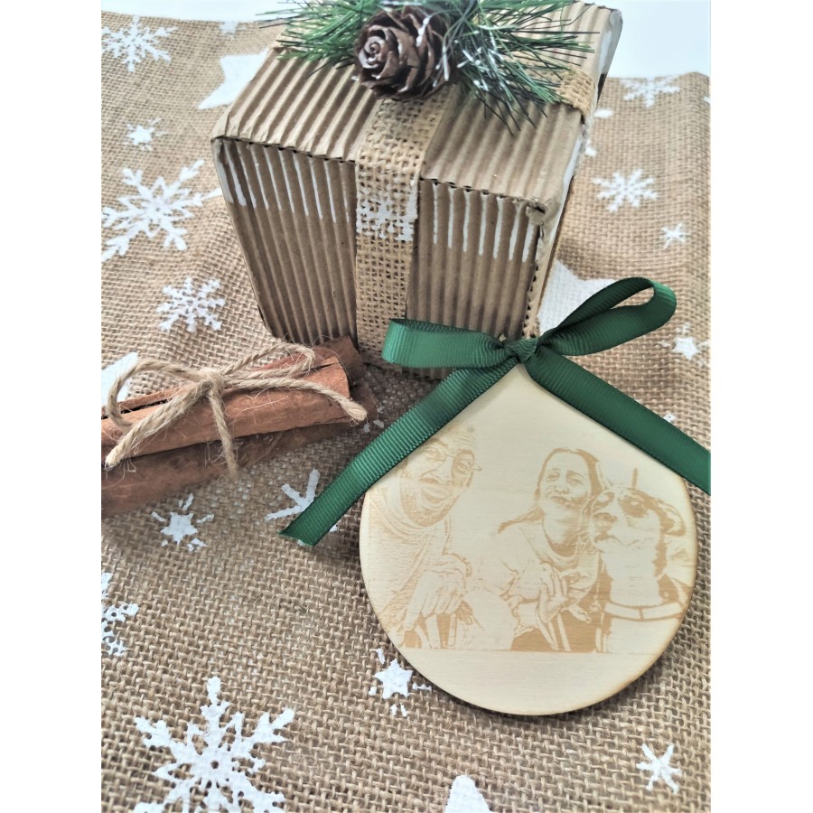 Não esquecer de gravar a sua personalização para poder adicionar ao carrinhoBola de Natal em choupo cor madeira natural ou mdf laminado a branco, com Fotogravação e recorte a laser.