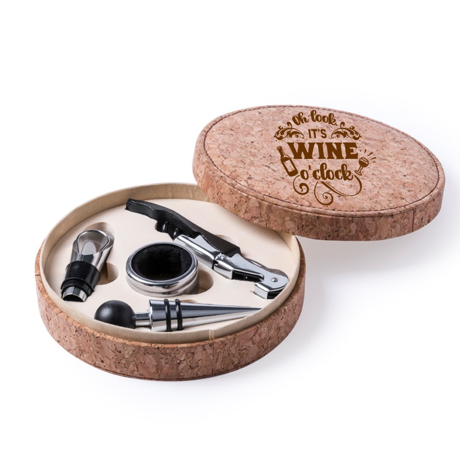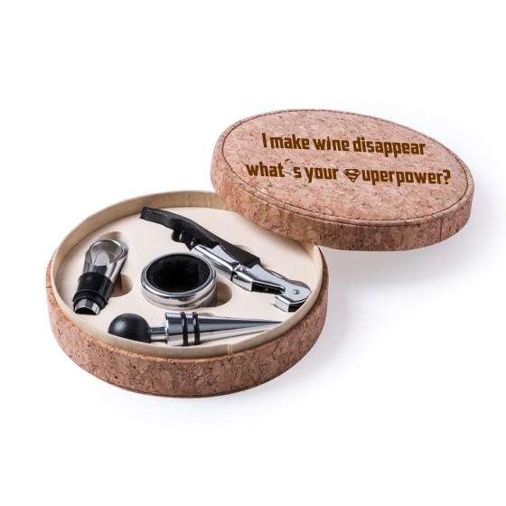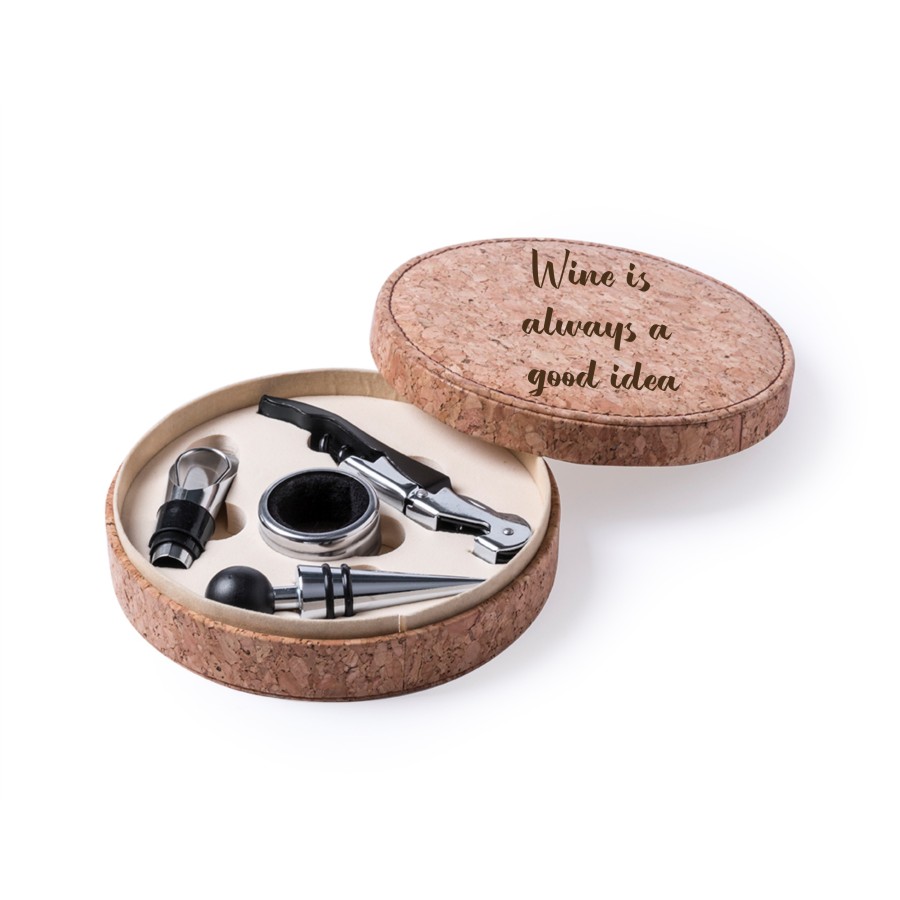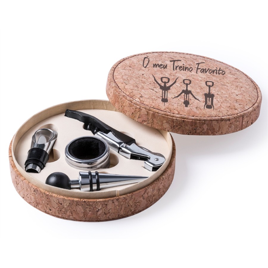 Caixa de cortiça com set de 4 peças essenciais para amantes de vinho.