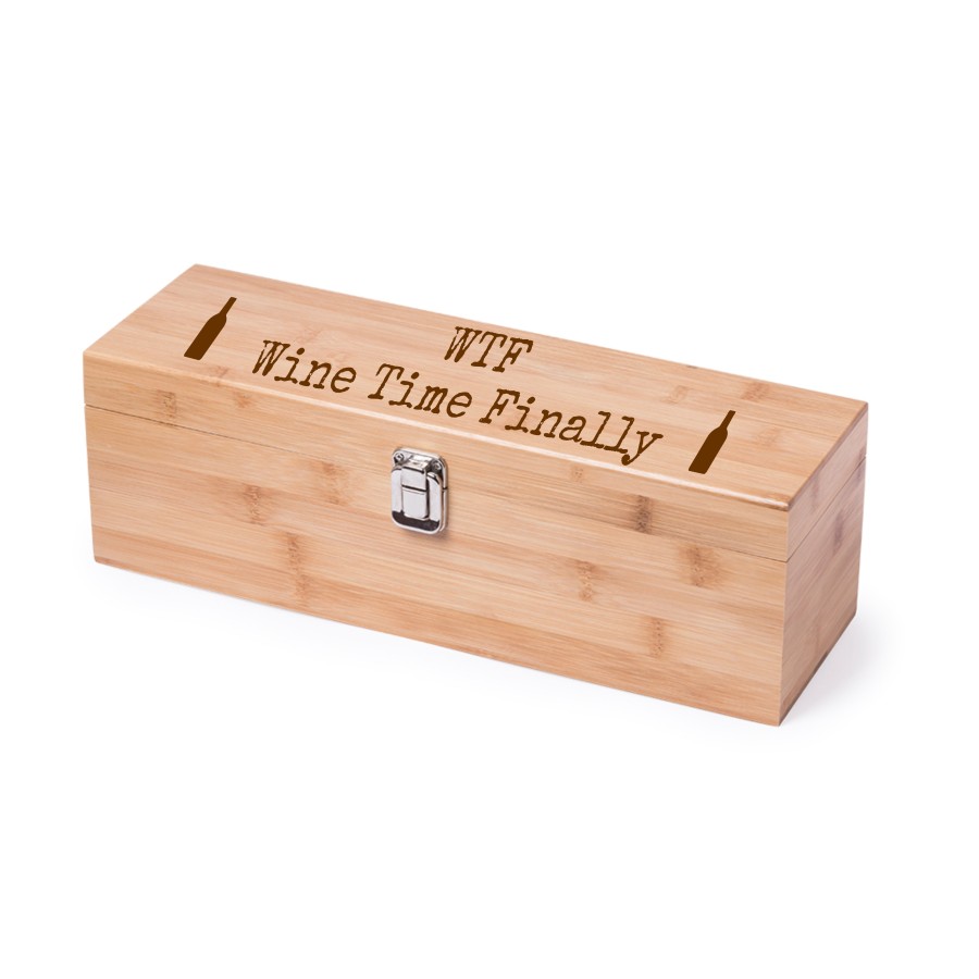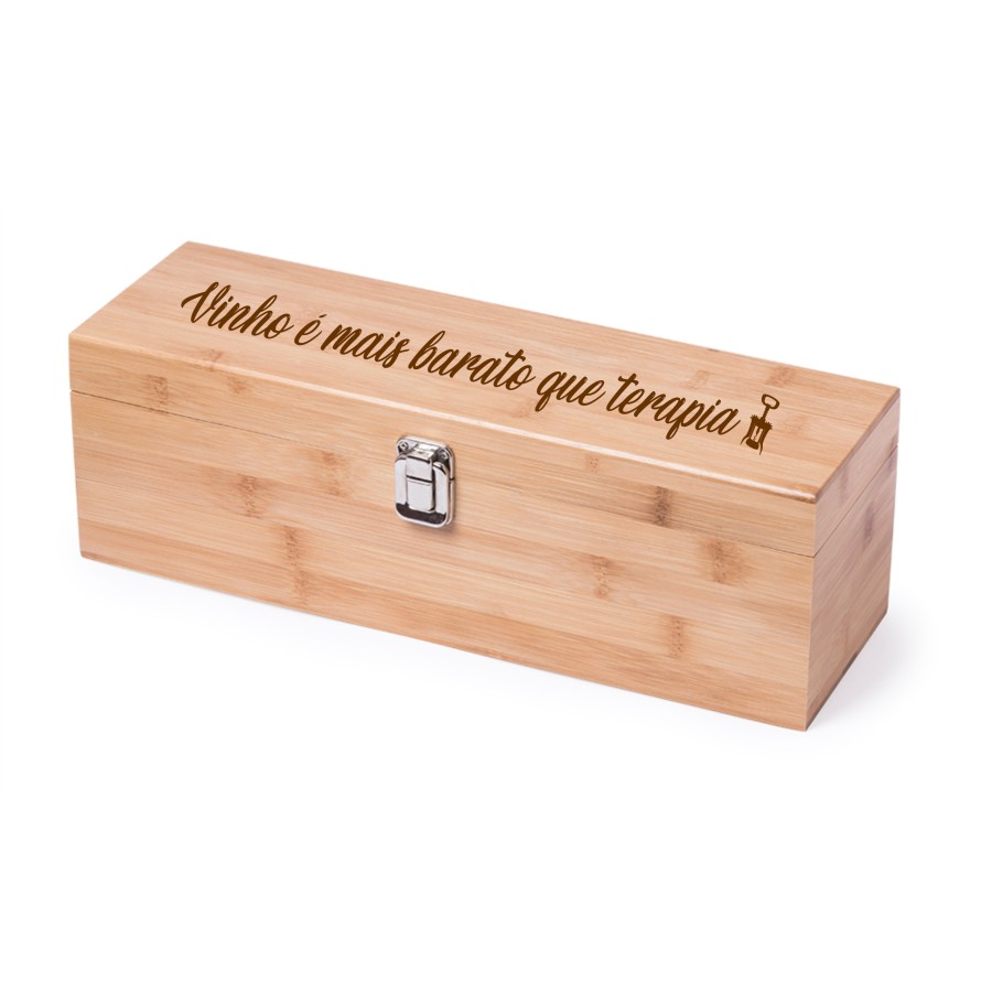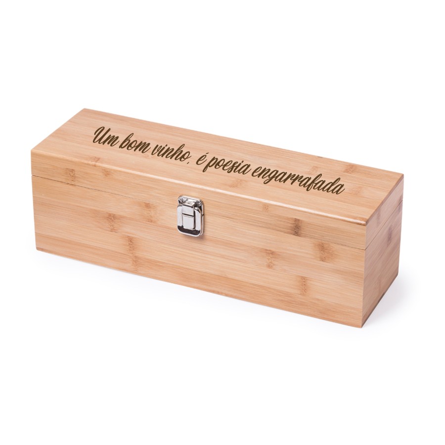 Não esquecer de gravar a sua personalização para poder adicionar ao carrinhoCaixa de bambu para garrafa de vinho, com set de 4 peças essenciais para amantes de vinho.