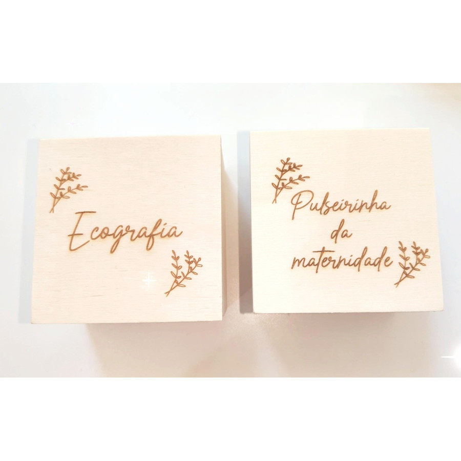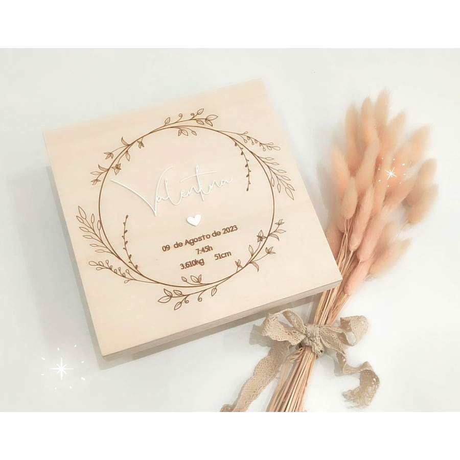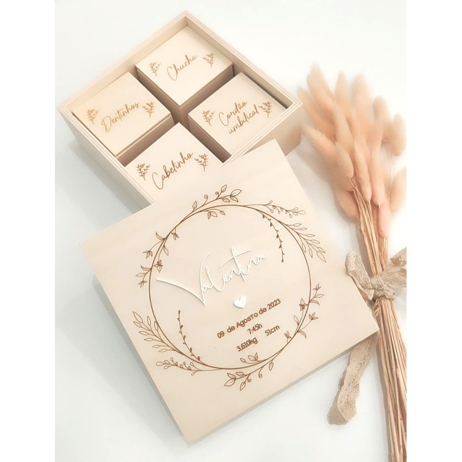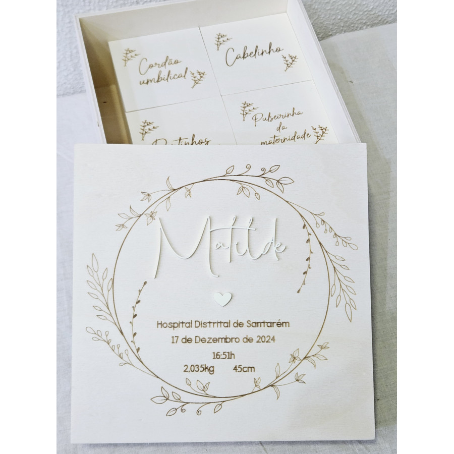 As quatro caixinhas de dentro são gravadas a laser com Cabelinho, Dentinhos, Cordão Umbilical e Chucha, mas podem ser personalizadas com outras opções como por exemplo Pulseirinha da maternidade ou Ecografia, se quiser alterar deverá indicar na parte da personalização.