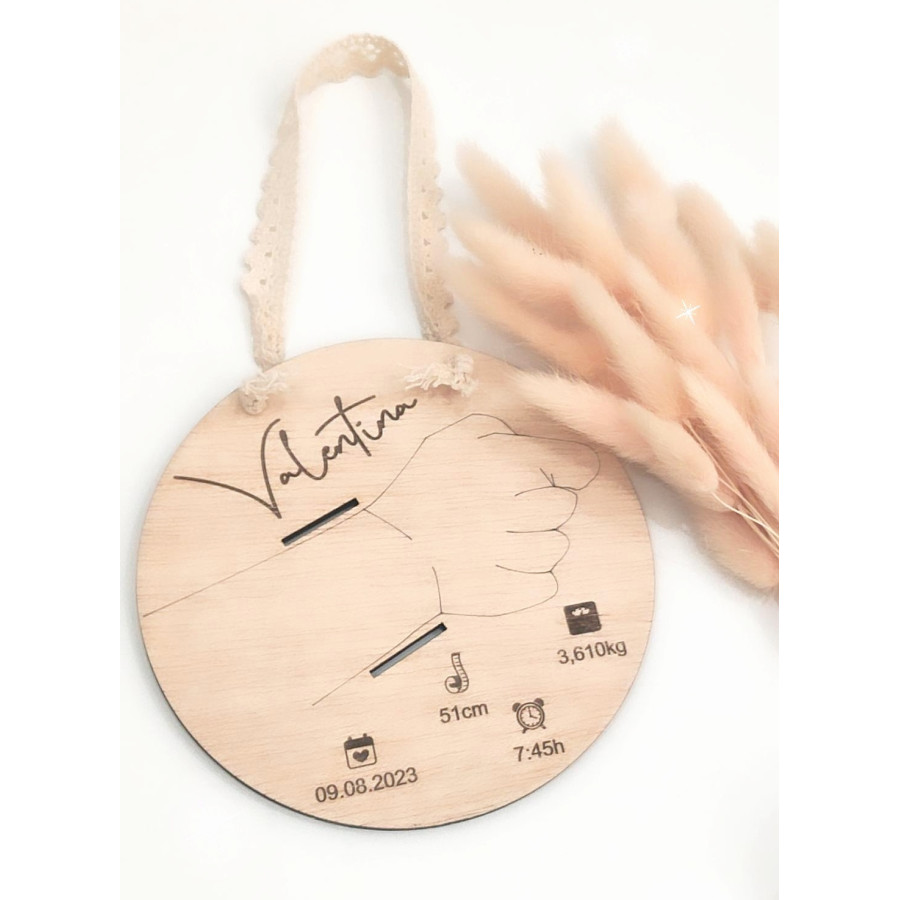 Placa em madeira para pulseira da Maternidade com nome e dados de nascimento.