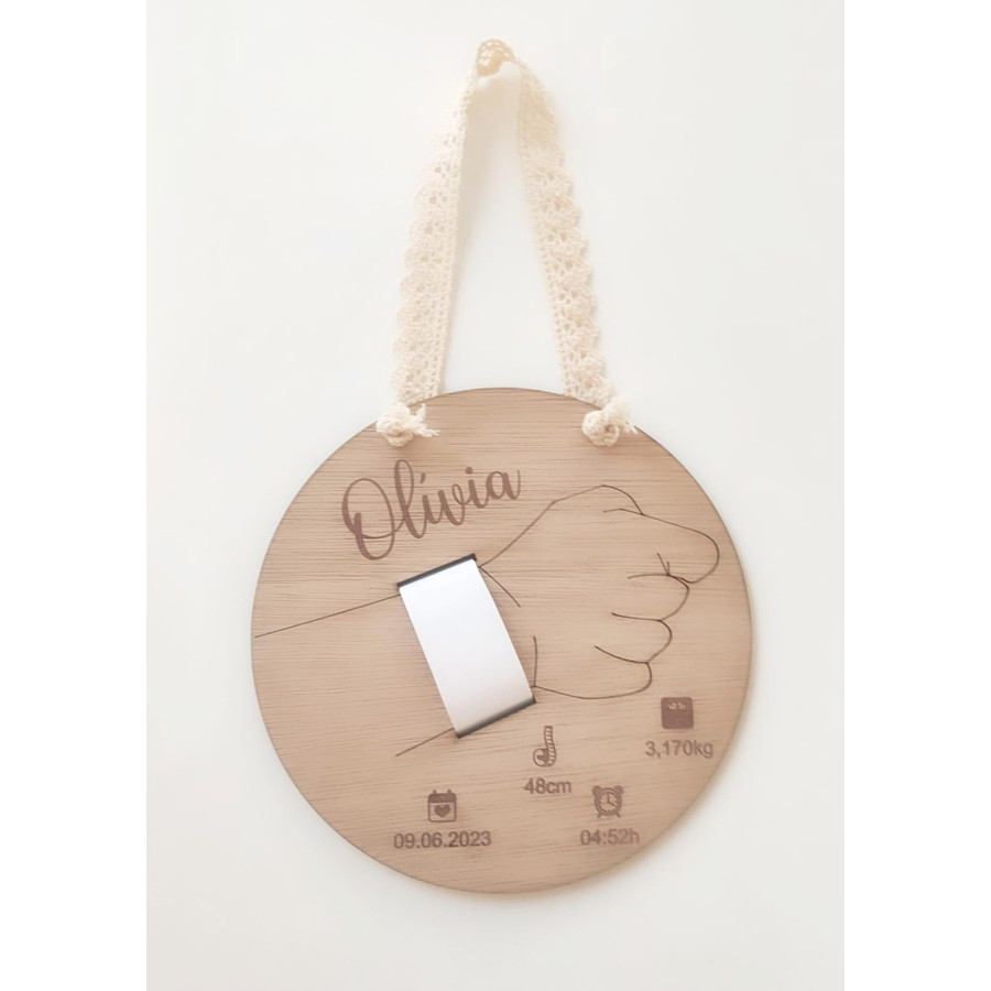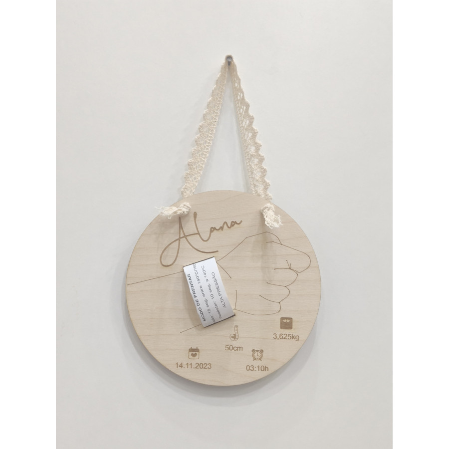 Não esquecer de gravar a sua personalização para poder adicionar ao carrinhoUma ideia super gira para decorar o quarto do bebé, esta placa em madeira para a pulseira da Maternidade, é gravada a laser, e além do nome do bebé, leva também os dados de nascimento (data, hora, peso e altura). Tem 2 ranhuras para que possa colocar a pulseirinha da maternidade e prender atrás.