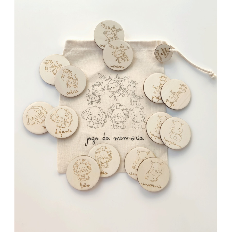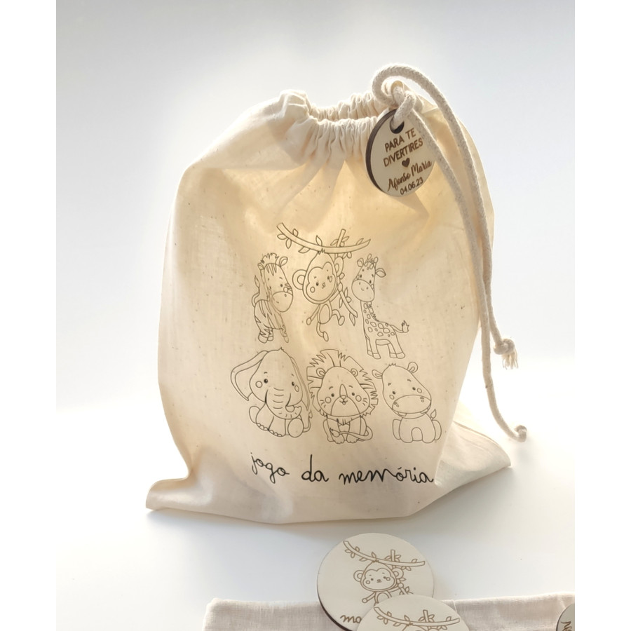 Jogo da Memória - Animais da Selva composto por 14 peças (2 de cada animal) e um saco de algodão para transportar.