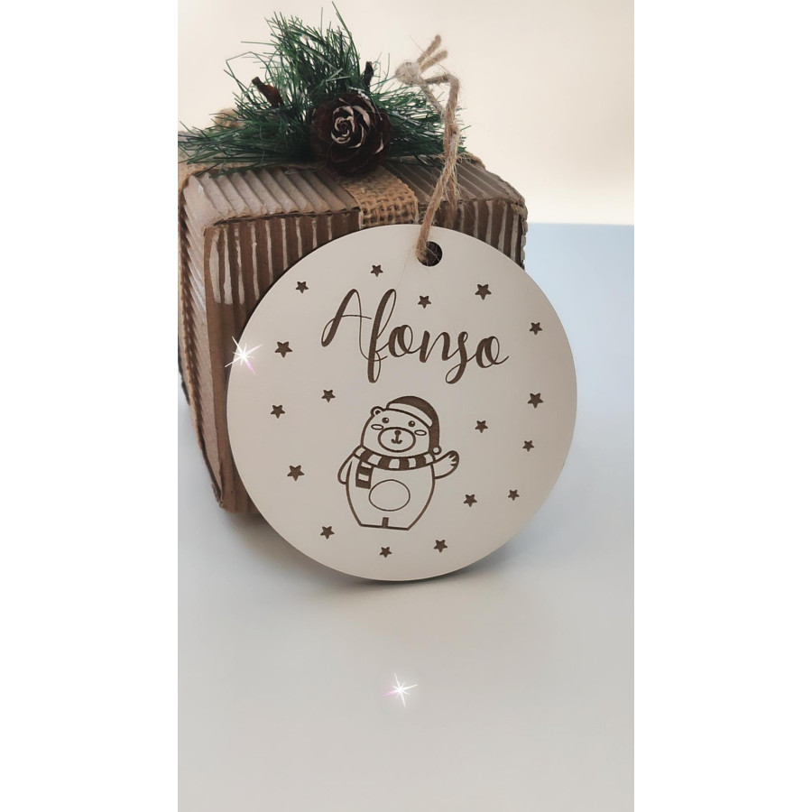Não esquecer de gravar a sua personalização para poder adicionar ao carrinhoBola de Natal em mdf laminado a branco ou choupo cor madeira natural, com gravação e recorte a laser.