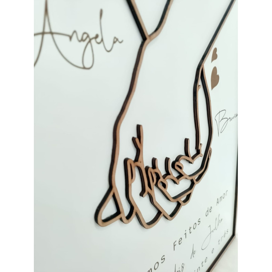 Quadro em mdf laminado a branco gravado a laser, as mãos e aro do quadro são em relevo em madeira cor natural fazendo contraste com o fundo em mdf laminado a branco.