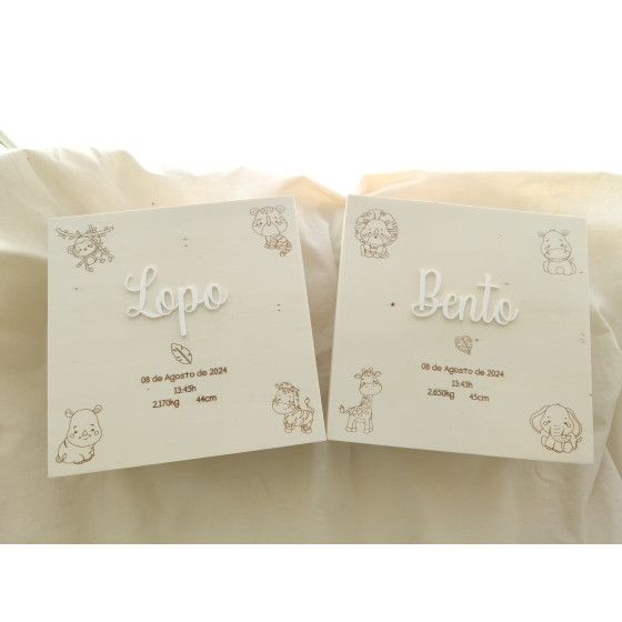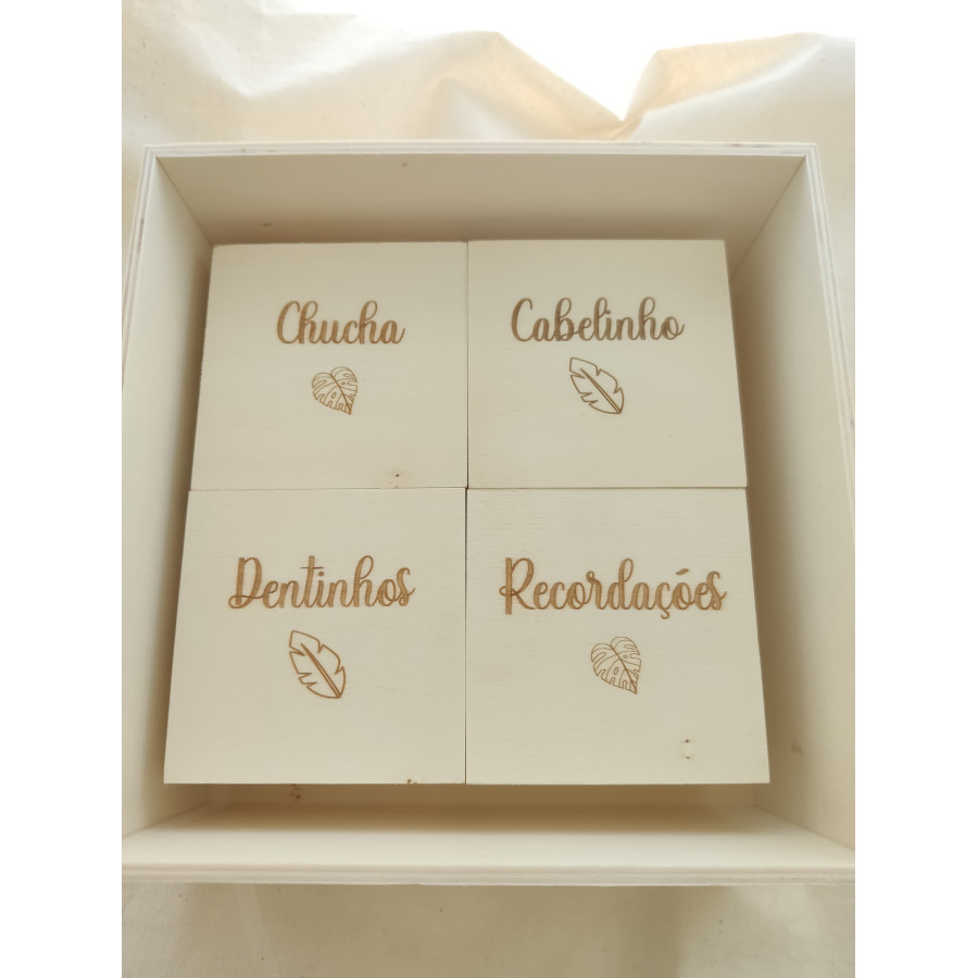 As quatro caixinhas de dentro são gravadas a laser com Cabelinho, Dentinhos, Cordão Umbilical e Pulseirinha da maternidade, mas podem ser personalizadas com outras opções como por exemplo Chucha, Recordações ou Ecografia, se quiser alterar deverá indicar na parte da personalização.