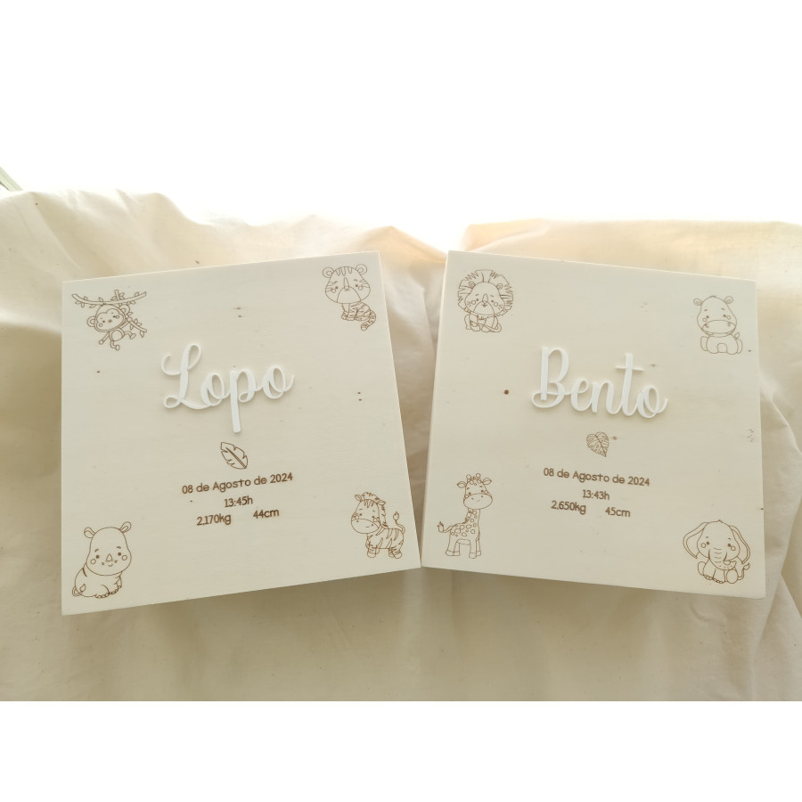Não esquecer de gravar a sua personalização para poder adicionar ao carrinhoEste maravilhoso conjunto de Caixas de Recordações de Bebé em madeira, tem a tampa da caixa maior personalizada com o nome do bebé em relevo(acrílico) e os dados de nascimento gravados a laser. Se pretender pode acrescentar o nome do Hospital/maternidade.