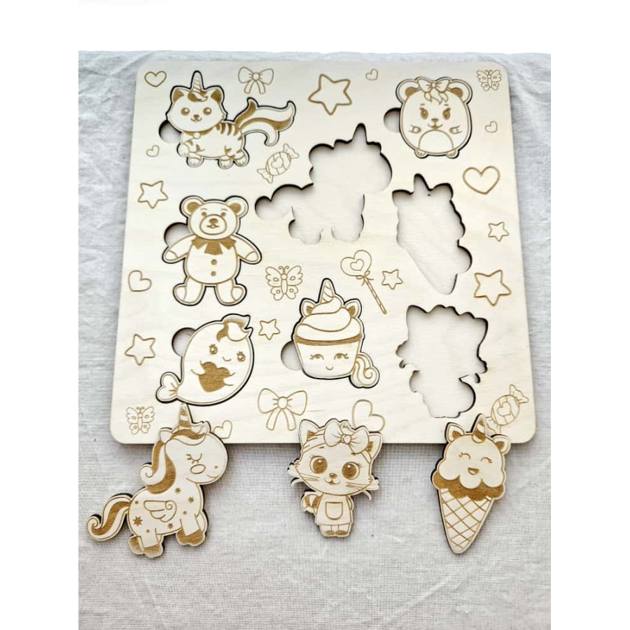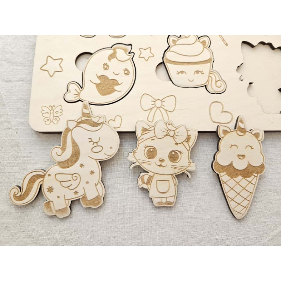 Um brinquedo encantador e educativo, perfeito para os mais pequenos! Este puzzle em madeira com 8 peças traz unicórnios e outros bonecos fofinhos que despertam a imaginação e a curiosidade da criança.