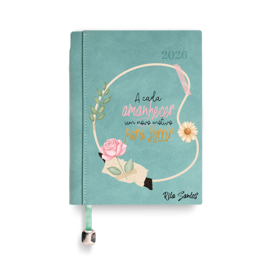 Comece cada dia com inspiração e boa energia com esta agenda diária A5 personalizada com a frase “A cada Amanhecer um novo motivo para sorrir”, é o acessório ideal para quem gosta de planear os dias com motivação e estilo.