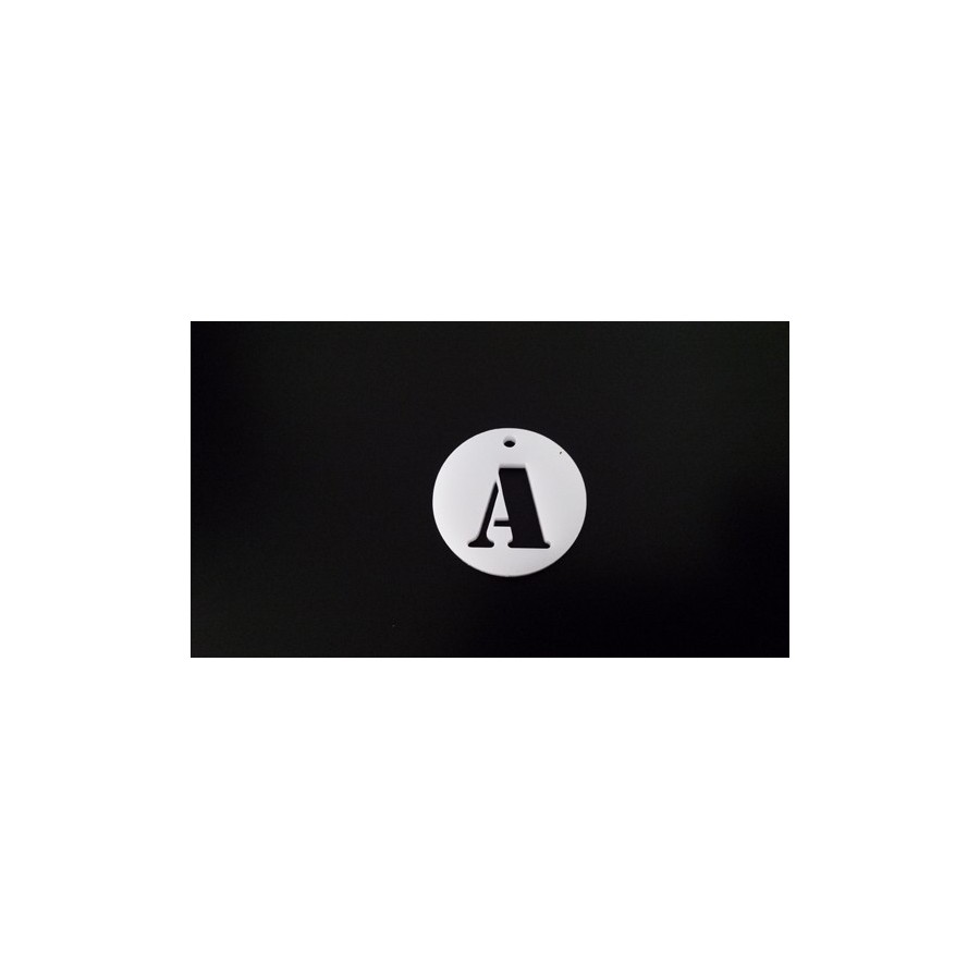 Pendente  em acrilico, redondo, com corte a laser no interior com formato de letra, com furo para colocação de fio ou argola.