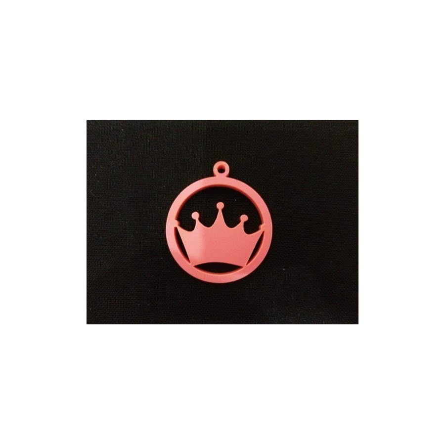 Pendente  em acrilico, redondo, com corte a laser no interior fazendo o formato de coroa, com argola com furo para colocação de fio ou argola.