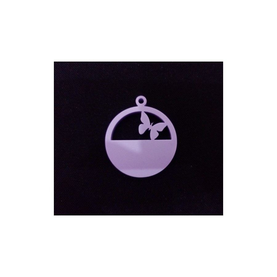 Pendente  em acrilico, redondo, com corte a laser no interior fazendo o formato de Borboleta pequenina, com argola com furo para colocação de fio ou argola.